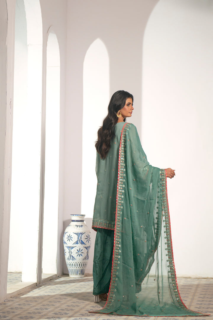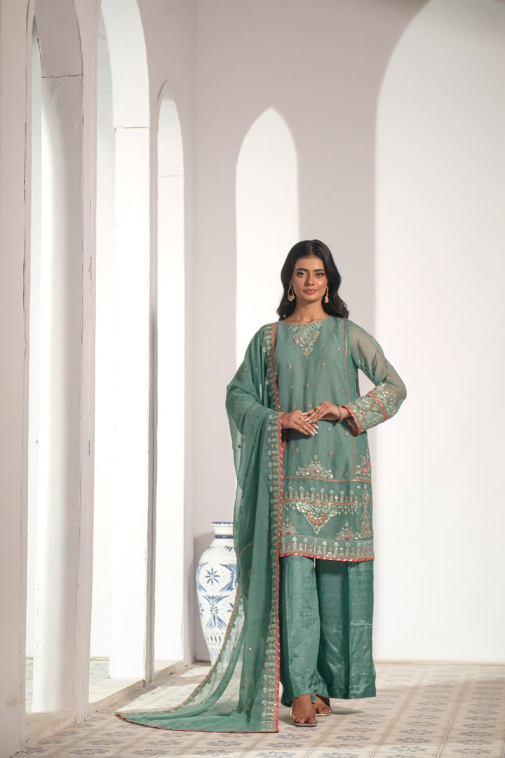Elevate your festive style with this luxurious 4-piece embroidered chiffon suit, a perfect blend of elegance and craftsmanship. Designed with exquisite attention to detail, this ensemble showcases **intricate thread embroidery enhanced with zari, sequins, gota, and mirror work— creating a timeless and graceful look for any special occasion.